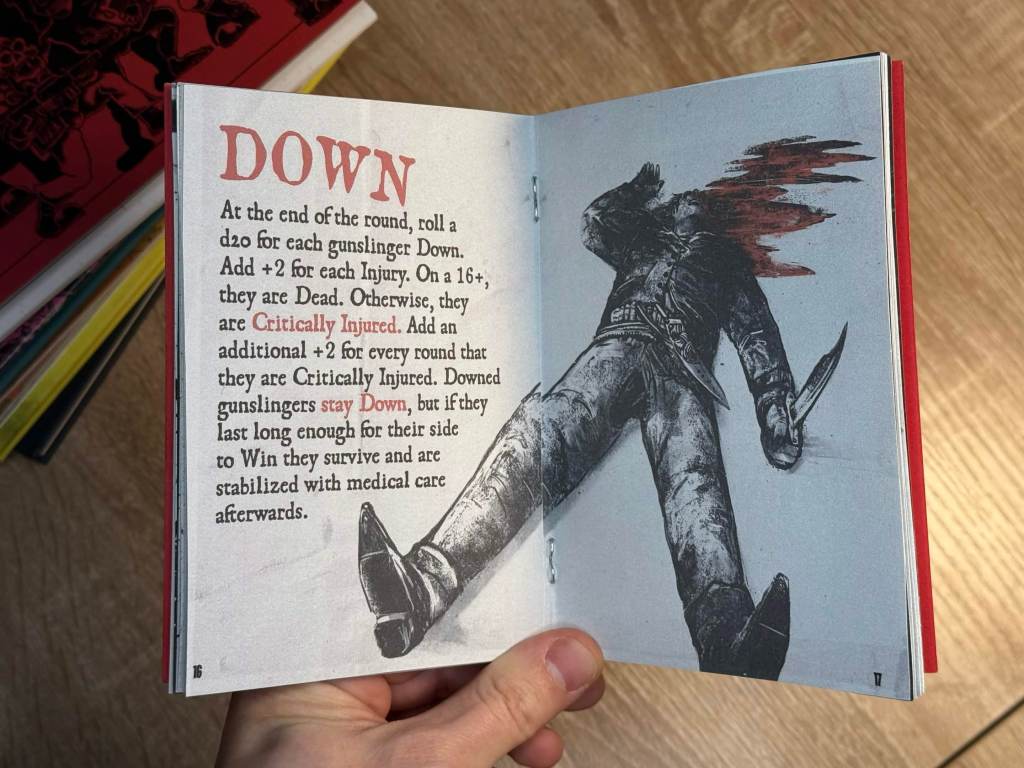 This game includes handedness, and it’s more than just a quirky add on. Each gunslinger’s dominant hand is randomly determined, using roughly accurate percentages as found in the real world. Most gunslingers are going to be right handed, with about 10% of shooters preferring the left. But a fortunate few, about 1%, take life by both hands (i.e. ambidextrous). This comes into play with the game’s injury system, which uses a die roll on a deceptively simple table to wound the gunslinger. The results are quick to determine yet meaningfully change the wounded’s capabilities. A shot to the arm could make it difficult to aim straight. And if it’s bad enough, it’ll render the limb nothing more than dead weight. Or that fated bit of lead finds its way into your unfortunate head. And if that’s the case, well, good luck with that.