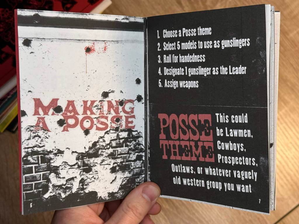 I’ll avoid going section by section and just state that the weight and design of this game is very well adapted towards the fiction it conveys. It’s Luke Gearing’s Violence, soaked in whiskey and hacked to fit .44 caliber rounds. Things happen fast, both on the table and when it comes to creating a posse. Action resolution is determined by a d20 with a simple d6 dice pool for any advantages or disadvantages. Five models on each side, with just a handful of choices for each character. Speaking of hands…